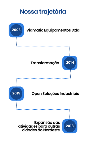 Nossa história começa em 2003, quando surgimos como Viamatic Equipamentos Ltda. Ao longo dos anos, passamos por uma transformação significativa, que culminou na nossa reinvenção como Open Soluções Industriais em 2015. Essa mudança não foi apenas de nome, mas também de visão, de missão e de compromisso com nossos clientes. Desde então, temos expandido nossas atividades para outras cidades do Nordeste, um passo que iniciamos em 2018 e que nos permitiu alcançar e servir a um público ainda maior.